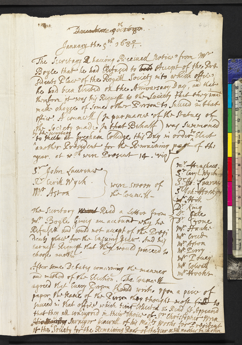 The Secretary . . . . Read a Letter from mr. Boyle Giuing an account of why he Refused and could not accept of the Presi dents place for the Ensuing Year. And his Earnest Request that they would proceed to choose another. After some Debates concerning the manner and method of the Election. The Councell | Dr. Crone Mr. Haake Mr Creed Mr Aton Mr. Perry Mr. Pouey Mr Colwall Mr. Hooke |